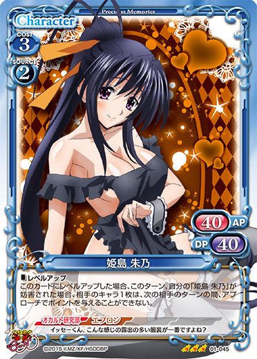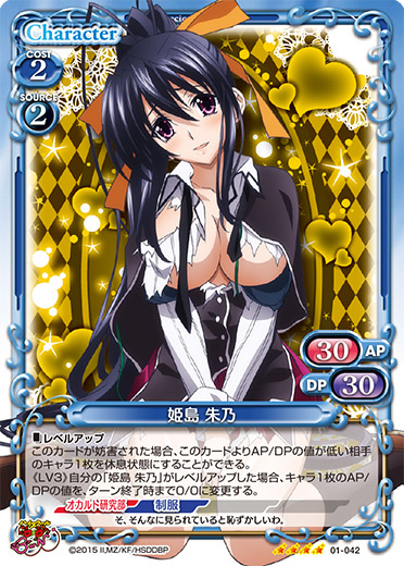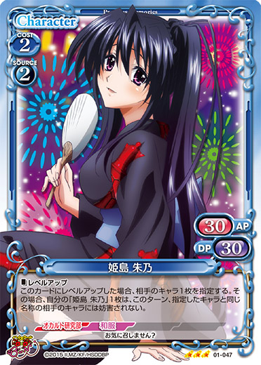 | 〔レベルアップ〕このカードにレベルアップした場合、相手のキャラ1枚を指定する。その場合、自分の「姫島 朱乃」1枚は、このターン、指定したキャラと同じ名称の相手のキャラには妨害されない。 | ||
