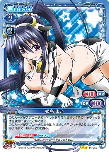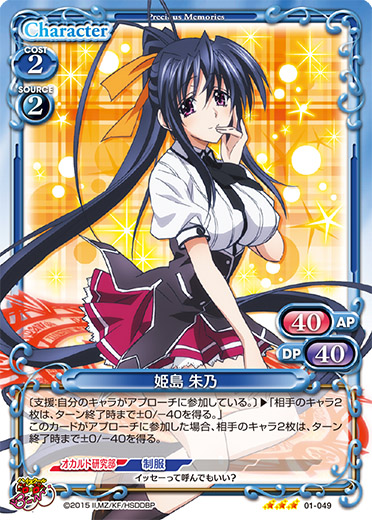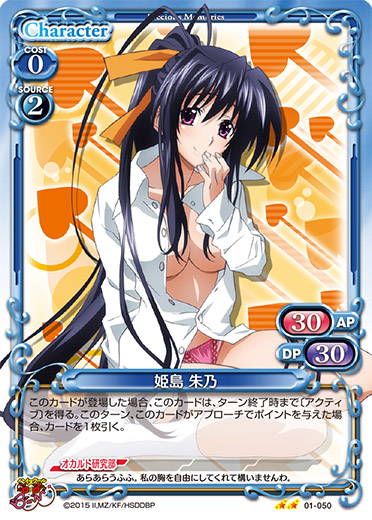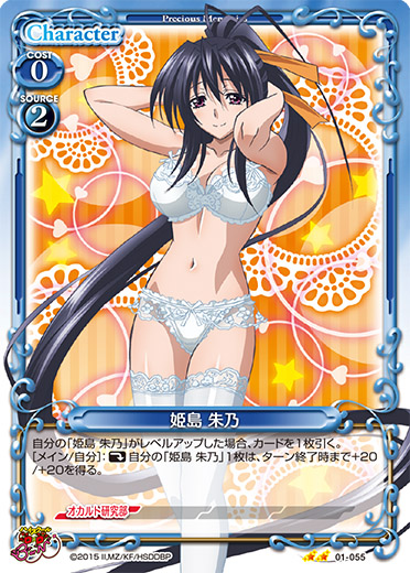 | 自分の「姫島 朱乃」がレベルアップした場合、カードを1枚引く。[メイン/自分]:《休》自分の「姫島 朱乃」1枚は、ターン終了時まで+20/+20を得る。 | ||