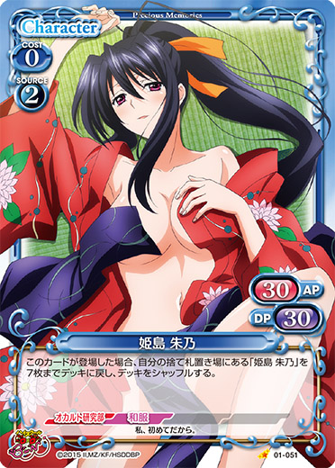| このカードが登場した場合、自分の捨て札置き場にある「姫島 朱乃」を7枚までデッキに戻し、デッキをシャッフルする。 | ||