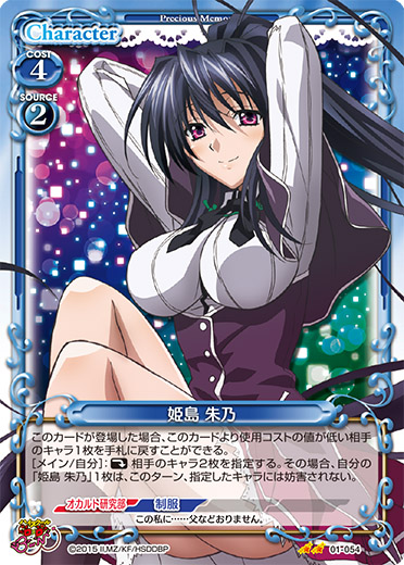 | このカードが登場した場合、このカードより使用コストの値が低い相手のキャラ1枚を手札に戻すことができる。[メイン/自分]:《休》相手のキャラ2枚を指定する。その場合、自分の「姫島 朱乃」1枚は、このターン、指定したキャラには妨害されない。 | ||