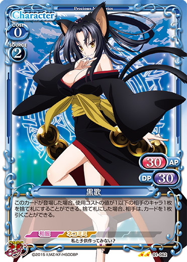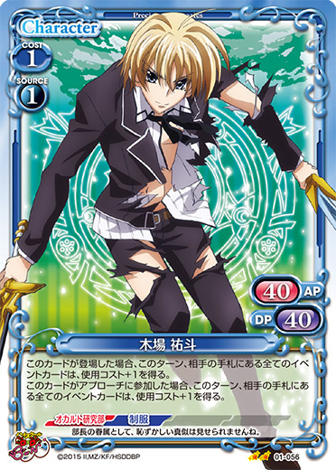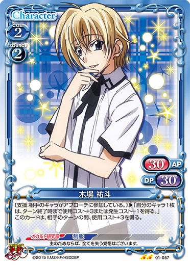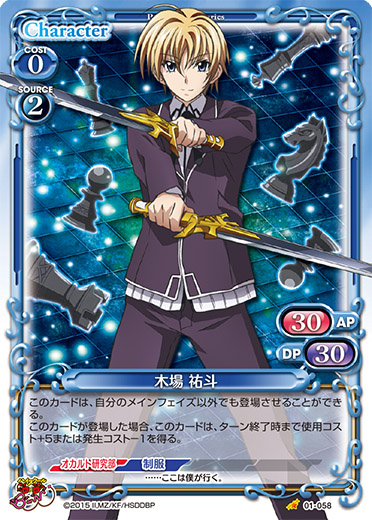 | このカードは、自分のメインフェイズ以外でも登場させることができる。このカードが登場した場合、自分の「姫島 朱乃」1枚は、ターン終了時まで使用コスト+3を得る。その場合、そのキャラを活動状態にすることができる。 | ||