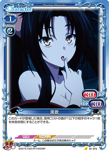 | このカードが登場した場合、使用コストの値が1以下の相手のキャラ1枚を休息状態にすることができる。 | ||