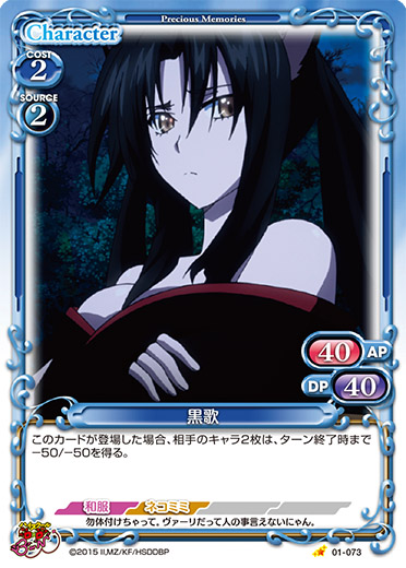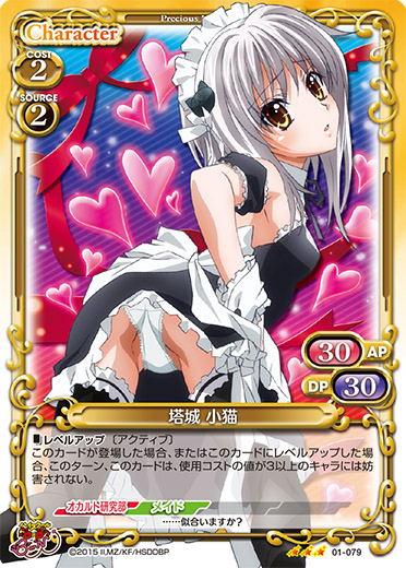| 〔レベルアップ〕このカードは、自分のターンの間、+20/+20を得る。このカードにレベルアップした場合、手札から「塔城 小猫」1枚を場に出すことができる。この効果でキャラを場に出した場合、そのキャラは、ターン終了時まで+30/+30を得る。 | ||