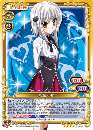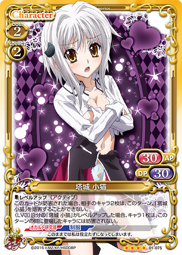 | 〔レベルアップ〕 〔アクティブ〕このカードが妨害された場合、相手のキャラ2枚は、このターン、「塔城 小猫」を妨害することができない。《LV3》自分の「塔城 小猫」がレベルアップした場合、キャラ1枚は、このターンの間に登場したキャラには妨害されない。 | ||