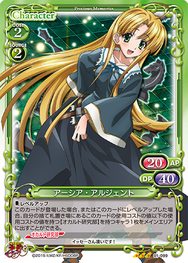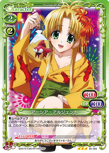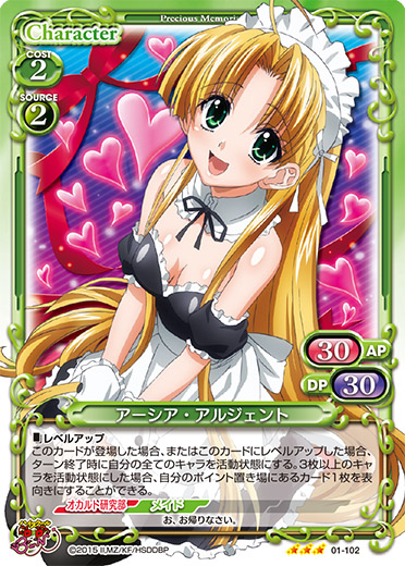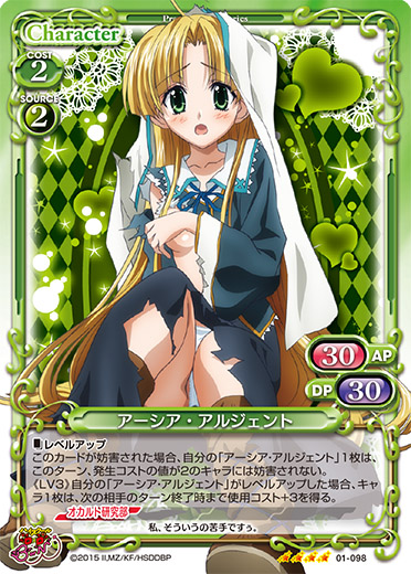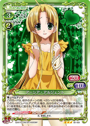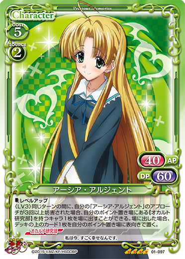 | 〔レベルアップ〕このカードにレベルアップした場合、自分の「アーシア・アルジェント」1枚は、このターン、発生コストの値が2のキャラには妨害されない。 | ||