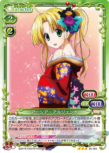 | このカードが登場、または相手のアプローチによって自分のポイント置き場に置かれた場合、デッキの上のカード5枚を見て、その中にある「アーシア・アルジェント」1枚を抜き出し、表にしてから手札に加える。その後、残りのカードを任意の順番でデッキの下に移す。 | ||