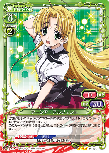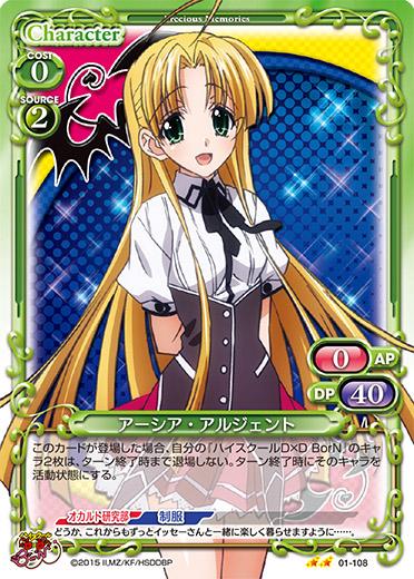| このカードが登場した場合、自分の『ハイスクールD×D BorN』のキャラ2枚は、ターン終了時まで退場しない。ターン終了時にそのキャラを活動状態にする。 | ||