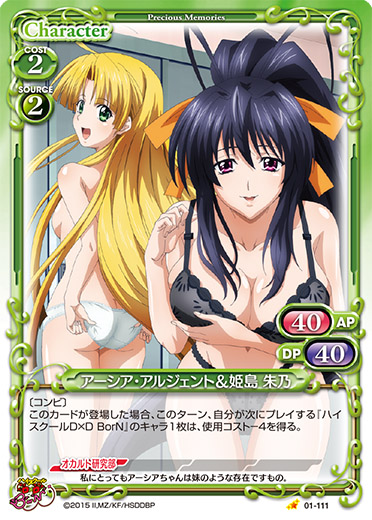 | 〔コンビ〕このカードが登場した場合、このターン、自分が次にプレイする『ハイスクールD×D BorN』のキャラ1枚は、使用コスト-4を得る。 | ||