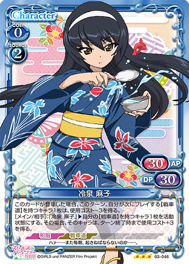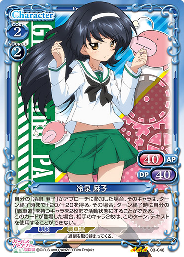 | 自分の「冷泉 麻子」がアプローチに参加した場合、そのキャラは、ターン終了時まで+20/+20を得る。その場合、ターン終了時に自分の【戦車道】を持つキャラを2枚まで活動状態にすることができる。このカードが登場した場合、相手のキャラ2枚は、このターン、テキストを使用することができない。 | ||