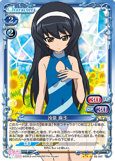 | このカードは、自分の【戦車道】を持つキャラが10枚以上いる場合、+20/+20を得る。このカードが登場した場合、デッキの上のカード5枚を見て、その中にある「冷泉 麻子」1枚を抜き出し、表にしてから手札に加える。その後、残りのカードを任意の順番でデッキの下に移す。 | ||