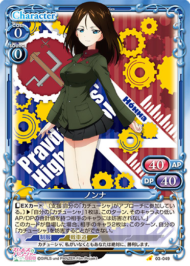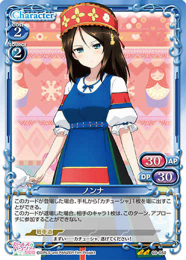 | このカードが登場した場合、手札から「カチューシャ」1枚を場に出すことができる。このカードが退場した場合、相手のキャラ1枚は、このターン、アプローチに参加することができない。 | ||