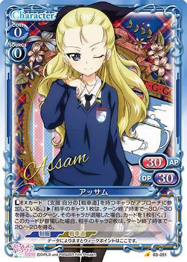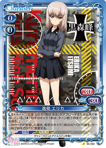 | 〔EXカード〕〔支援:自分の「西住 まほ」がアプローチまたは妨害に参加している。〕▸「相手のキャラ1枚は、ターン終了時まで-20/-20を得る。」このカードが登場した場合、相手のキャラ1枚のAP/DPの値を、ターン終了時まで0/0に変更する。 | ||