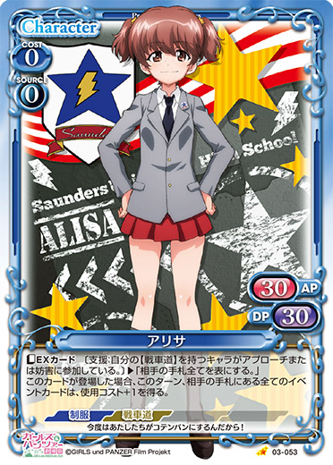 | 〔EXカード〕〔支援:自分の【戦車道】を持つキャラがアプローチに参加している。〕▸「相手のキャラ1枚は、ターン終了時まで-30/-30を得る。このターン、そのキャラが退場した場合、カードを1枚引く。」このカードが登場した場合、相手のキャラ2枚は、ターン終了時まで-20/-20を得る。 | ||