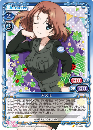 | 〔コンビ〕〔アクティブ〕このカードのアプローチで相手のキャラが退場した場合、カードを1枚引く。[メイン/両方]:《1》自分の【戦車道】を持つキャラ2枚は、ターン終了時まで+10/+10を得る。その場合、カードを1枚引く。 | ||