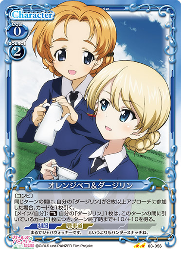 | 〔コンビ〕同じターンの間に、自分の「ダージリン」が2枚以上アプローチに参加した場合、カードを1枚引く。[メイン/自分]:《休》自分の「ダージリン」1枚は、このターンの間に引いているカード1枚につき、ターン終了時まで+10/+10を得る。 | ||