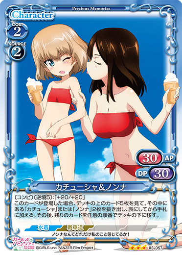 | 〔コンビ〕〔逆境5〕:「+20/+20」このカードが登場した場合、デッキの上のカード5枚を見て、その中にある「カチューシャ」または「ノンナ」2枚を抜き出し、表にしてから手札に加える。その後、残りのカードを任意の順番でデッキの下に移す。 | ||