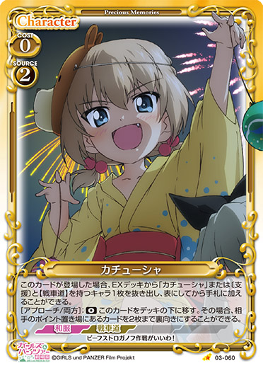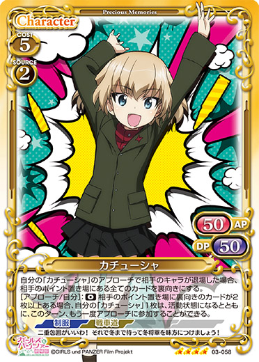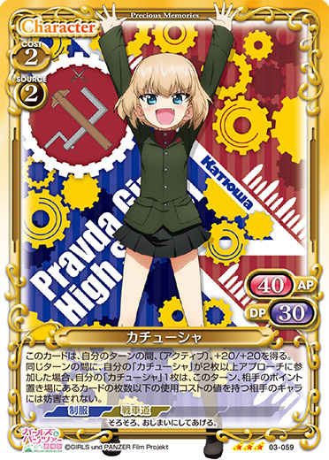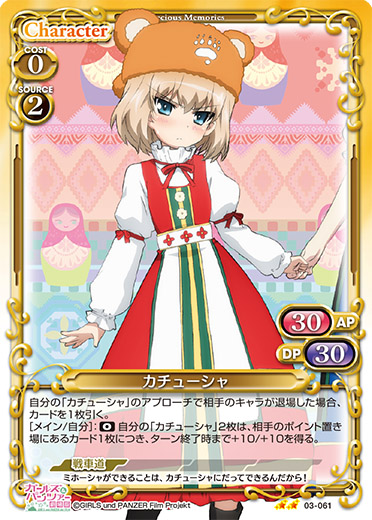 | 自分の「カチューシャ」のアプローチで相手のキャラが退場した場合、カードを1枚引く。[メイン/自分]:《0》自分の「カチューシャ」2枚は、相手のポイント置き場にあるカード1枚につき、ターン終了時まで+10/+10を得る。 | ||