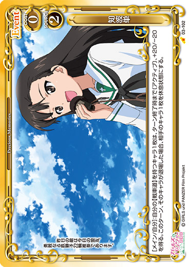 | [メイン/自分]:自分の【戦車道】を持つキャラ1枚は、ターン終了時まで〔アクティブ〕、+20/-20を得る。このターン、そのキャラが退場した場合、相手のキャラ1枚を休息状態にする。 | ||