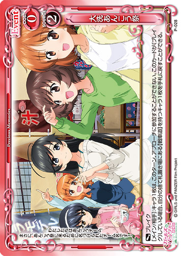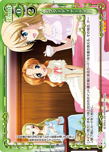 | このカードがセットされているキャラは、自分のキャラが退場した場合、活動状態になる。[アプローチ/両方]:《0》このカードをデッキの下に移す。その場合、自分の【戦車道】を持つキャラ1枚を活動状態にする。 | ||