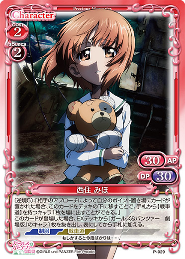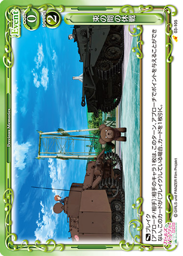 | [アプローチ/両方]:自分の【戦車道】を持つキャラ1枚は、ターン終了時まで退場しない。そのキャラがアプローチに参加している場合、自分のポイント置き場にあるカード1枚を表向きにすることができる。 | ||