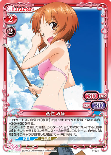 | このカードは、自分の【水着】を持つキャラが5枚以上いる場合、+30/+30を得る。このカードが登場した場合、このターン、自分が次にプレイする【戦車道】を持つキャラ1枚は、使用コスト-3を得る。このターン、自分の【水着】を持つキャラが登場した場合、カードを1枚引く。 | ||
