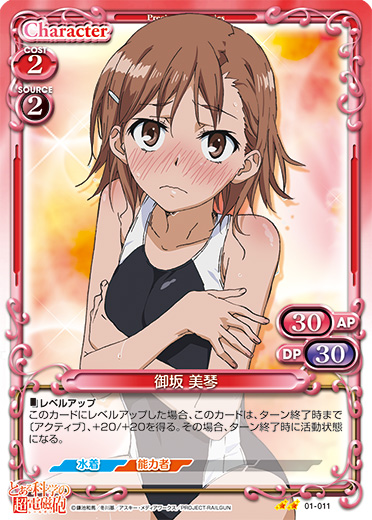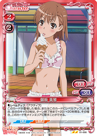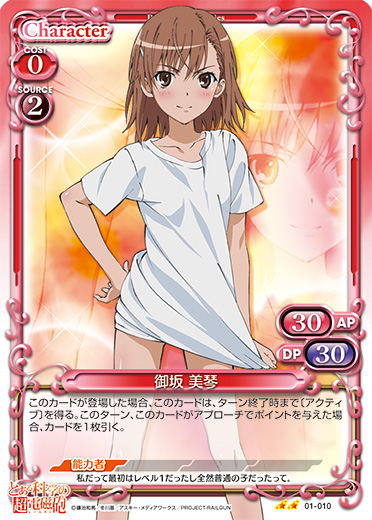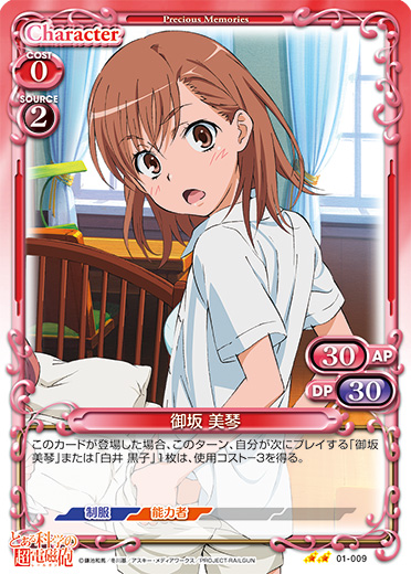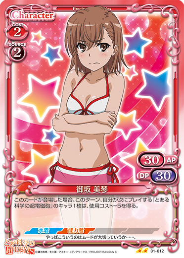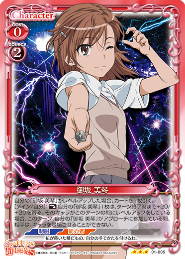 | このカードが登場した場合、このターン、自分が次にプレイする『とある科学の超電磁砲』のキャラ1枚は、使用コスト-5を得る。 | ||