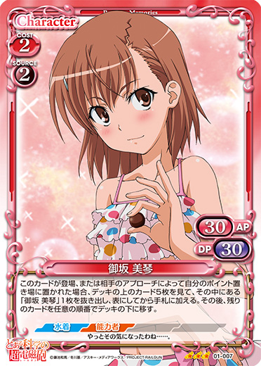 | このカードが登場、または相手のアプローチによって自分のポイント置き場に置かれた場合、デッキの上のカード5枚を見て、その中にある「御坂 美琴」1枚を抜き出し、表にしてから手札に加える。その後、残りのカードを任意の順番でデッキの下に移す。 | ||