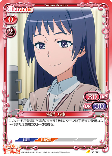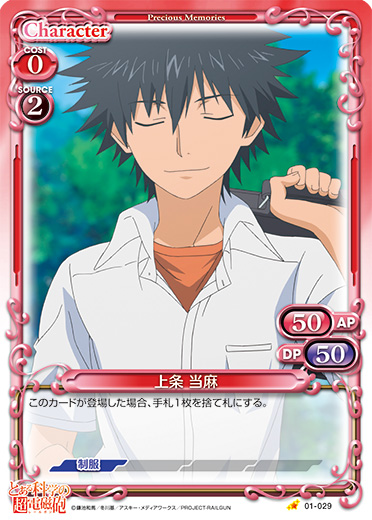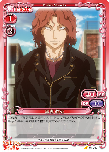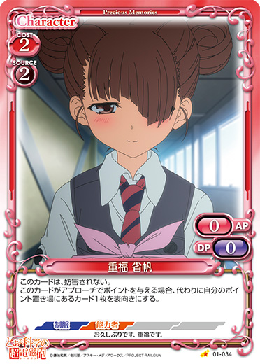 | このカードが登場した場合、サポートエリアにいるAP/DPの値を持つ相手のキャラを2枚まで捨て札にすることができる。 | ||