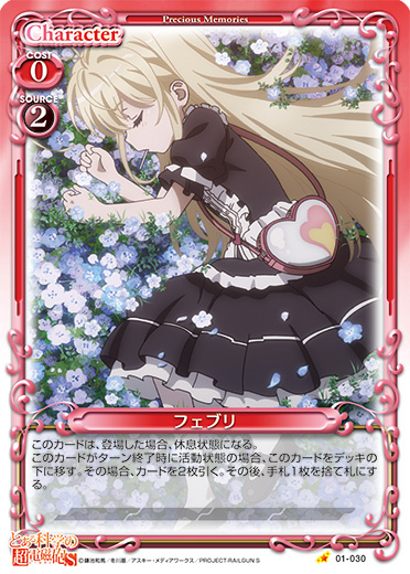 | このカードは、登場した場合、休息状態になる。このカードがターン終了時に活動状態の場合、このカードをデッキの下に移す。その場合、カードを2枚引く。その後、手札1枚を捨て札にする。 | ||
