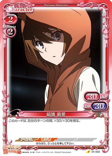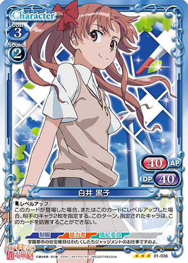 | 〔レベルアップ〕同じターンの間に、自分の「白井 黒子」が3枚以上アプローチに参加した場合、カードを1枚引く。《LV3》このカードのアプローチで相手のキャラが退場した場合、相手のキャラ2枚は、このターン、「白井 黒子」を妨害することができない。 | ||