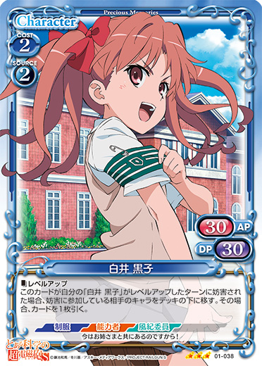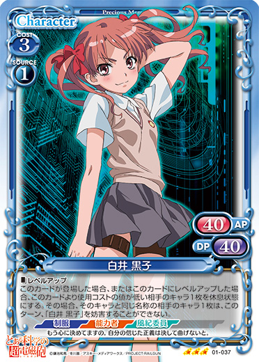 | 〔レベルアップ〕このカードが登場した場合、またはこのカードにレベルアップした場合、このカードより使用コストの値が低い相手のキャラ1枚を休息状態にする。その場合、そのキャラと同じ名称の相手のキャラ1枚は、このターン、「白井 黒子」を妨害することができない。 | ||
