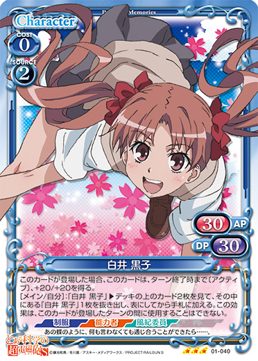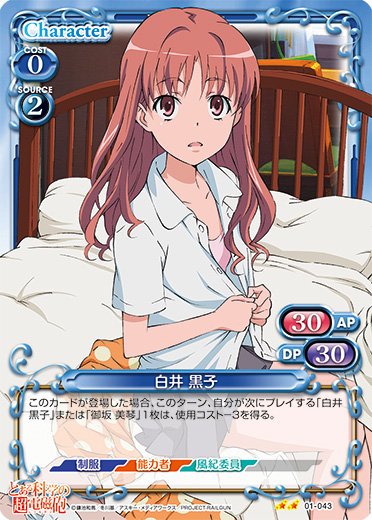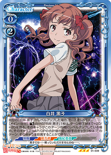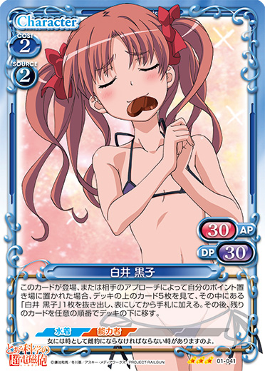 | このカードが登場、または相手のアプローチによって自分のポイント置き場に置かれた場合、デッキの上のカード5枚を見て、その中にある「白井 黒子」1枚を抜き出し、表にしてから手札に加える。その後、残りのカードを任意の順番でデッキの下に移す。 | ||