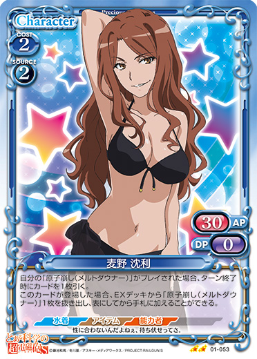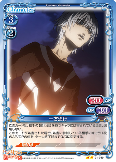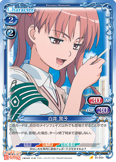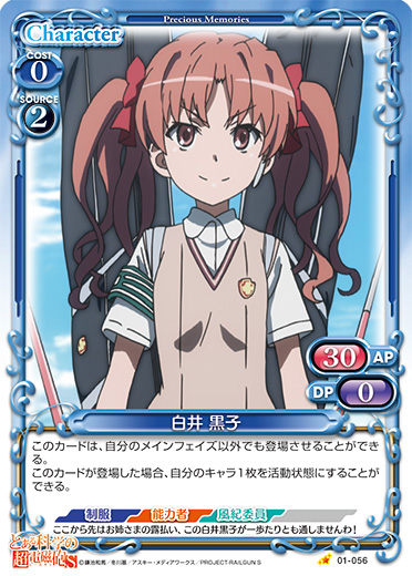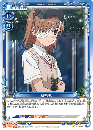 | このカードが登場した場合、手札1枚を捨て札にすることができる。捨て札にした場合、自分の捨て札置き場にある『とある科学の超電磁砲』のキャラ1枚を手札に戻す。 | ||