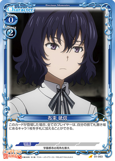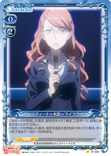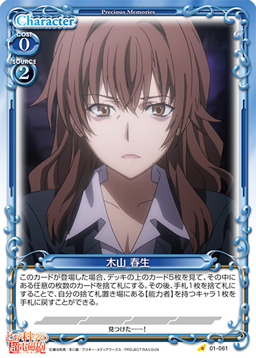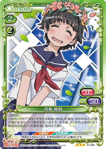 | このカードが登場した場合、EXデッキから『とある科学の超電磁砲』のカード1枚を抜き出し、表にしてから手札に加えることができる。このカードが退場した場合、自分のキャラを2枚まで活動状態にすることができる。 | ||