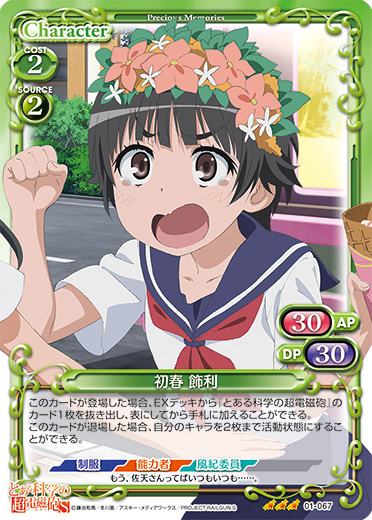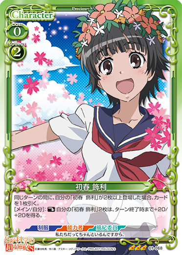 | 同じターンの間に、自分の「初春 飾利」が2枚以上登場した場合、カードを1枚引く。[メイン/自分]:《休》自分の「初春 飾利」2枚は、ターン終了時まで+20/+20を得る。 | ||