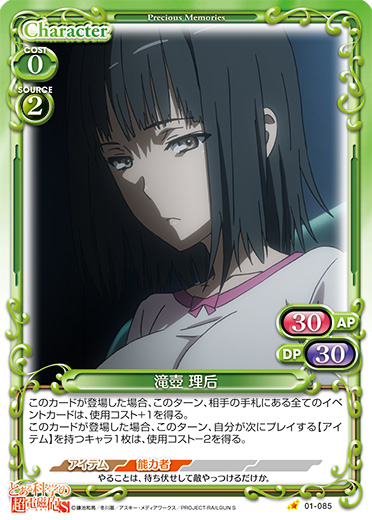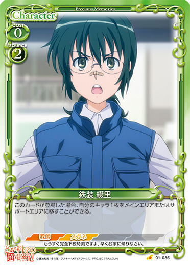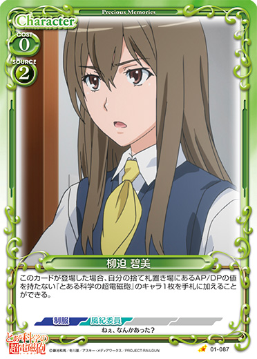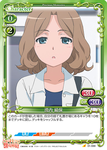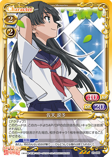 | このカードが登場した場合、自分の捨て札置き場にあるAP/DPの値を持たない『とある科学の超電磁砲』のキャラ1枚を手札に加えることができる。 | ||