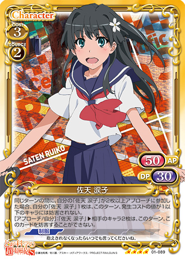 | 同じターンの間に、自分の「佐天 涙子」が2枚以上アプローチに参加した場合、自分の「佐天 涙子」1枚は、このターン、発生コストの値が1以下のキャラには妨害されない。[アプローチ/自分]:「佐天 涙子」▸相手のキャラ2枚は、このターン、このカードを妨害することができない。 | ||