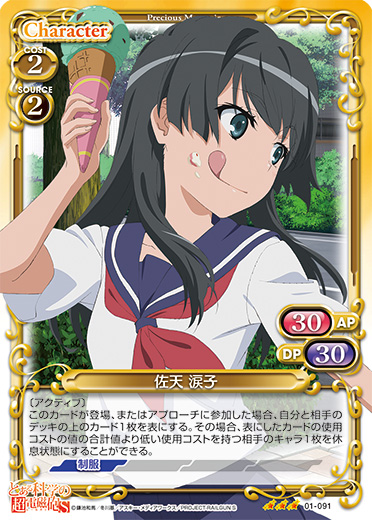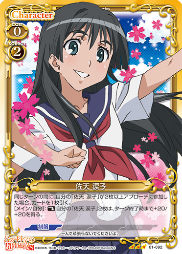 | 同じターンの間に、自分の「佐天 涙子」が2枚以上アプローチに参加した場合、カードを1枚引く。[メイン/自分]:《休》自分の「佐天 涙子」2枚は、ターン終了時まで+20/+20を得る。 | ||