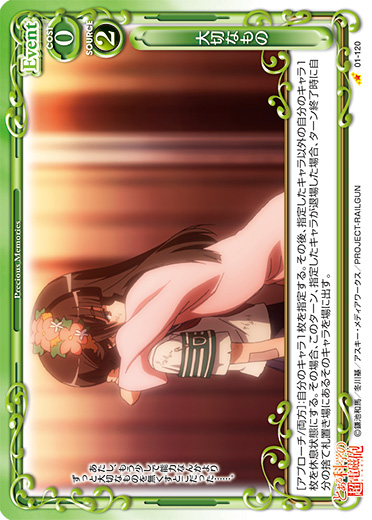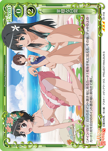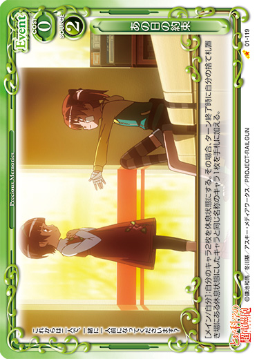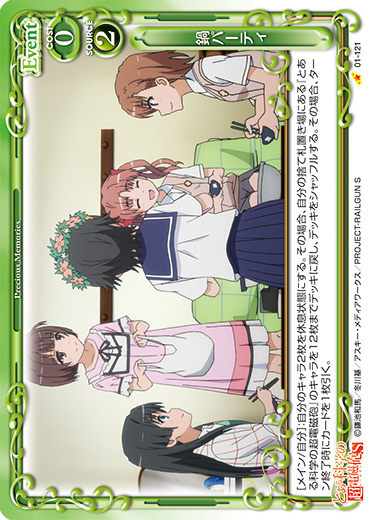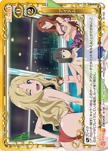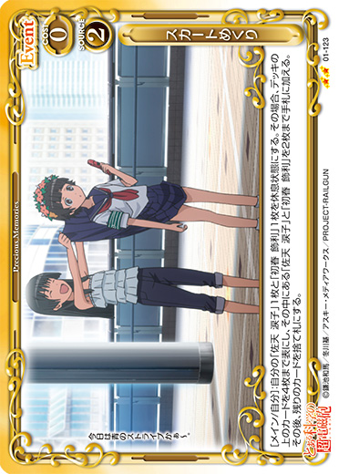 | [メイン/自分]:自分のキャラ2枚を休息状態にする。その場合、自分の捨て札置き場にある『とある科学の超電磁砲』のキャラを12枚までデッキに戻し、デッキをシャッフルする。その場合、ターン終了時にカードを1枚引く。 | ||