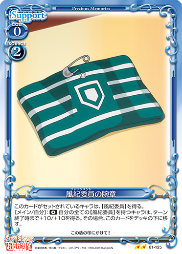 | このカードがセットされているキャラは、【風紀委員】を得る。[メイン/自分]:《0》自分の全ての【風紀委員】を持つキャラは、ターン終了時まで+10/+10を得る。その場合、このカードをデッキの下に移す。 | ||