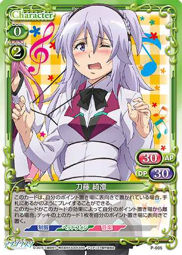 | このカードは、自分のポイント置き場に表向きで置かれている場合、手札にあるかのようにプレイすることができる。このカードがこのカードの効果によって自分のポイント置き場から離れる場合、デッキの上のカード1枚を自分のポイント置き場に表向きで置く。 | ||