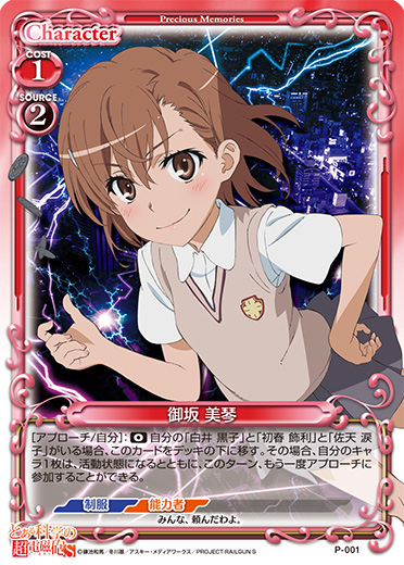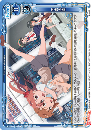 | [メイン/自分]:カードを1枚引く。このターン、自分の『とある科学の超電磁砲』のキャラがアプローチに参加した場合、カードを1枚引く。 | ||