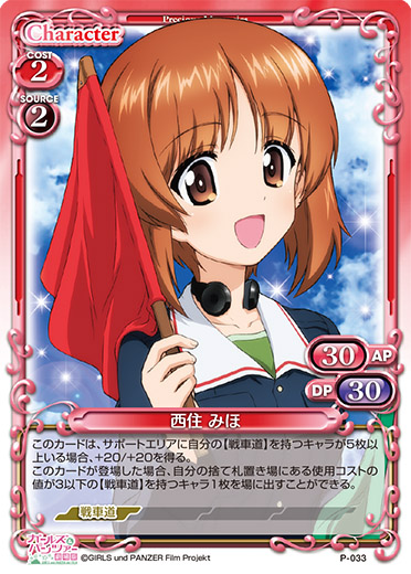 | このカードは、サポートエリアに自分の【戦車道】を持つキャラが5枚以上いる場合、+20/+20を得る。 このカードが登場した場合、自分の捨て札置き場にある使用コストの値が3以下の【戦車道】を持つキャラ1枚を場に出すことができる。 | ||