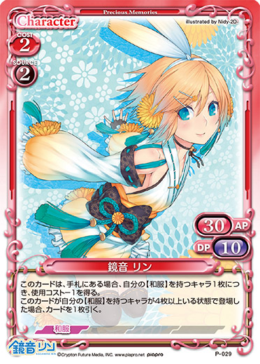 | このカードは、手札にある場合、自分の【和服】を持つキャラ1枚につき、使用コスト-1を得る。このカードが自分の【和服】を持つキャラが4枚以上いる状態で登場した場合、カードを1枚引く。 | ||