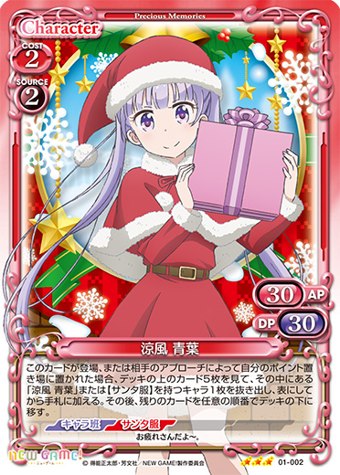 | このカードが登場、または相手のアプローチによって自分のポイント置き場に置かれた場合、デッキの上のカード5枚を見て、その中にある「涼風 青葉」または【サンタ服】を持つキャラ1枚を抜き出し、表にしてから手札に加える。その後、残りのカードを任意の順番でデッキの下に移す。 | ||