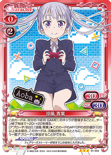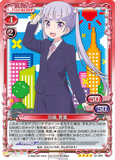 | このカードがアプローチでポイントを与えた場合、カードを1枚引く。このカードは、このカードがアプローチに参加している間、そのターンの間にプレイされている自分の『NEW GAME!』のカードの使用コストの合計値以下の使用コストを持つキャラには妨害されない。 | ||