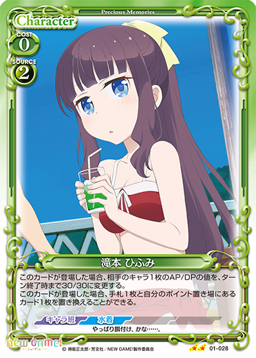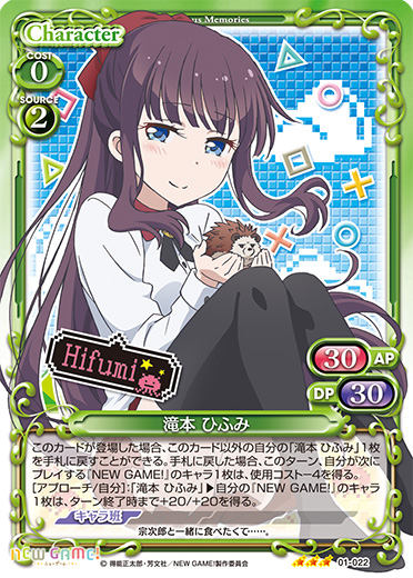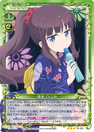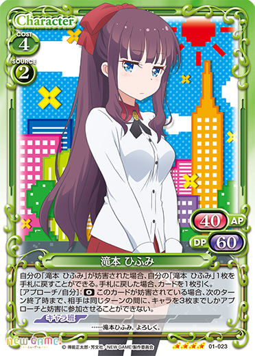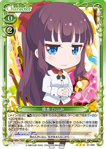 | [メイン/自分]:《休》自分の「滝本 ひふみ」2枚は、ターン終了時まで+20/+20を得る。[アプローチ/両方]:「滝本 ひふみ」▸自分の「滝本 ひふみ」1枚を活動状態にする。このターン、そのキャラは、もう一度アプローチに参加することができる。 | ||