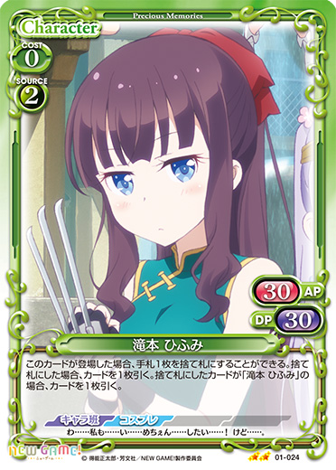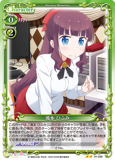 | このカードが登場した場合、手札1枚を捨て札にすることができる。捨て札にした場合、カードを1枚引く。捨て札にしたカードが「滝本 ひふみ」の場合、カードを1枚引く。 | ||