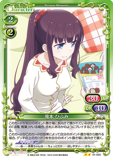 | このカードが自分のポイント置き場に表向きで置かれている状態で、自分の「涼風 青葉」がいる場合、手札にあるかのようにプレイすることができる。このカードがこのカードの効果によって自分のポイント置き場から離れる場合、デッキの上のカード1枚を自分のポイント置き場に表向きで置く。 | ||