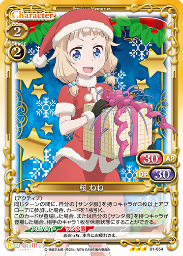 | 〔アクティブ〕自分の【サンタ服】を持つキャラが3枚以上アプローチに参加した場合、カードを1枚引く。このカードが登場した場合、または自分の【サンタ服】を持つキャラが登場した場合、相手のキャラ1枚を休息状態にすることができる。 | ||